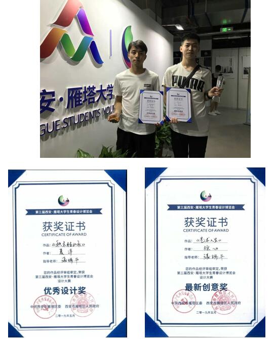 青春设计展风采,创业创新赢未来。5月27日,由中共西安市委、西安市人民政府主办,中共西安市雁塔区委、西安市雁塔区人民政府承办的“第三届西安·雁塔老员工青春设计博览会”胜利闭幕。2026世界杯指定网站参会作品在16所高校师生千余件作品中分别斩获“最新创意奖”(环设16级 徐心 葛泉琛)和“优秀设计奖”(环设16级 夏洋 朱琦 王国宇)。设计系张瑞平作为竞赛指导老师为参赛员工做了比赛辅导与培训。