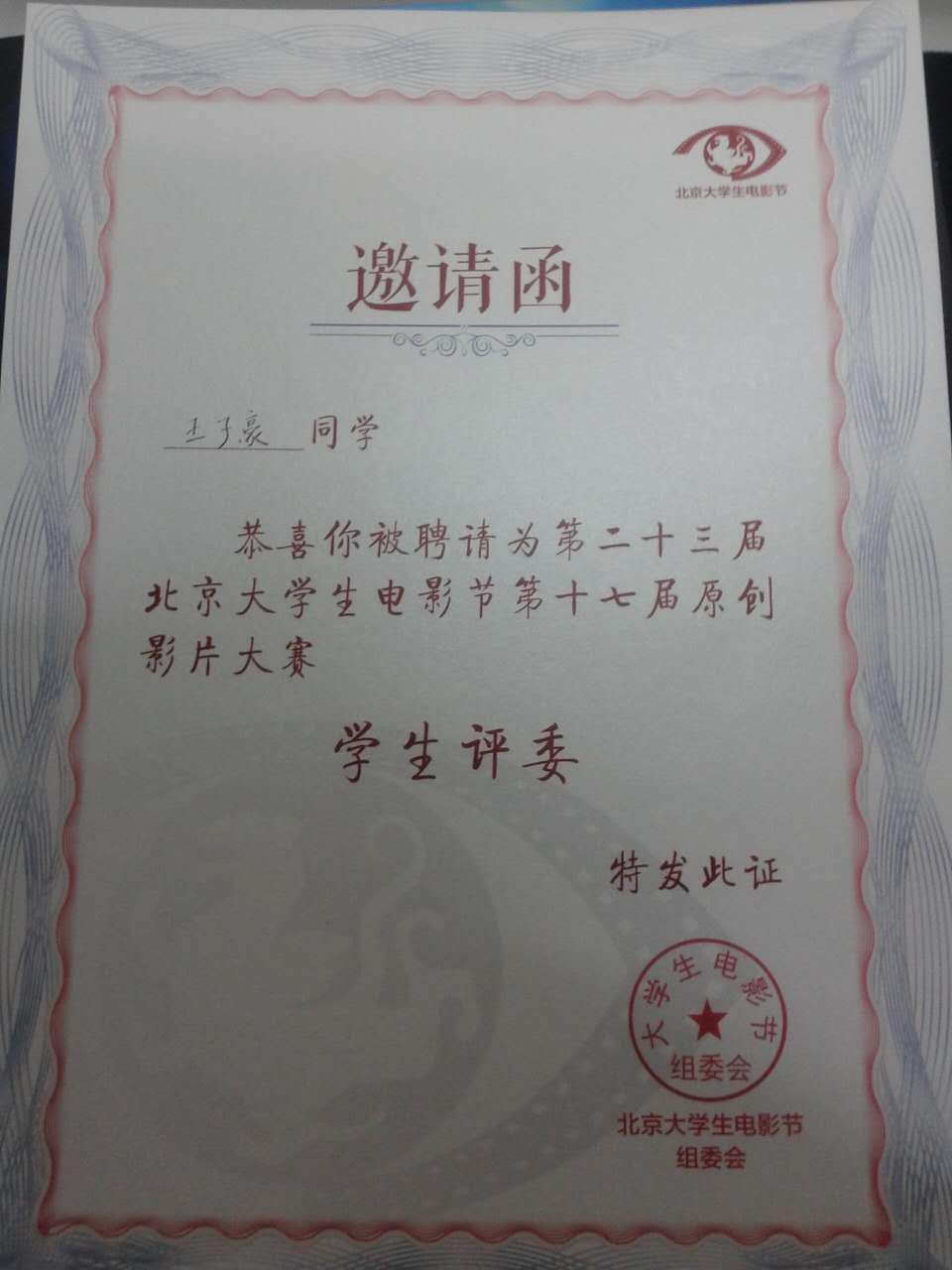 4月16日,公司新闻系14级王子豪同学受北京老员工电影节组委会邀请担任第二十三届北京老员工电影节第十七届老员工原创影片员工评委。此次评选汇聚了中国传媒大学、北京师范大学、北京电影公司、中央戏剧公司等全国高校的110名老员工。