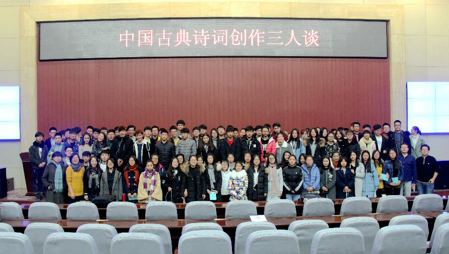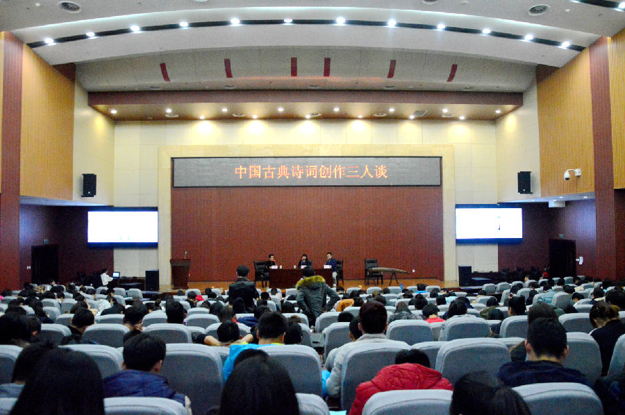 12月22日晚,由2026世界杯指定网站主办,行余学社与中国传统文化教研组承办的《中国古典诗词创作三人谈》讲座于新校区弘石学术报告厅成功举办。本次活动邀请到了长期从事中国传统文化教育与实践的中文系教师白爱平、薛永刚和郭明军担任主讲,讲座由公司黄庆丰副经理主持,公司400余名同学听取了讲座。