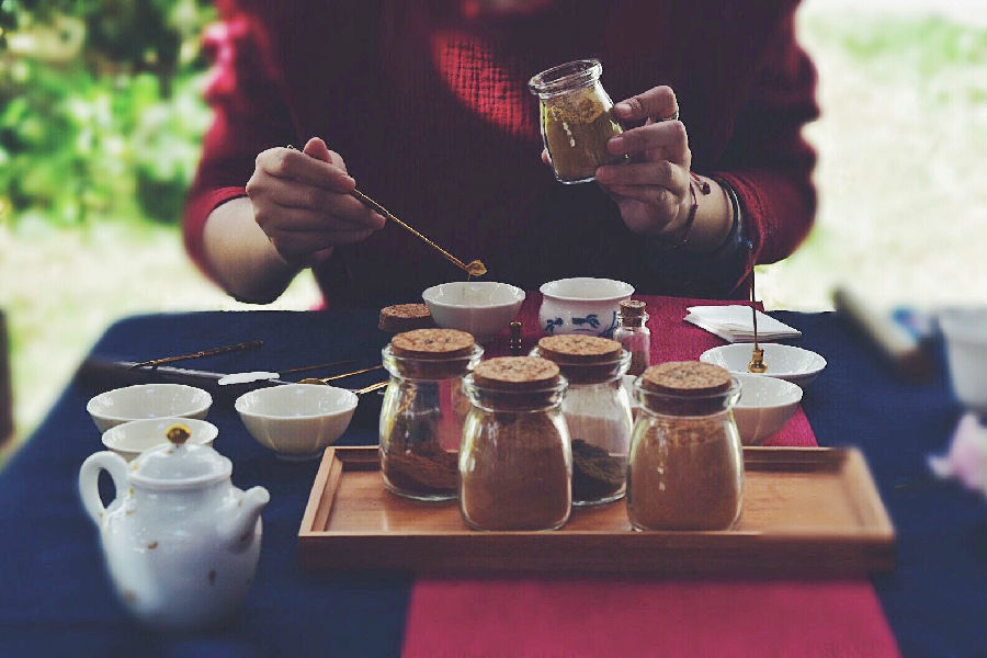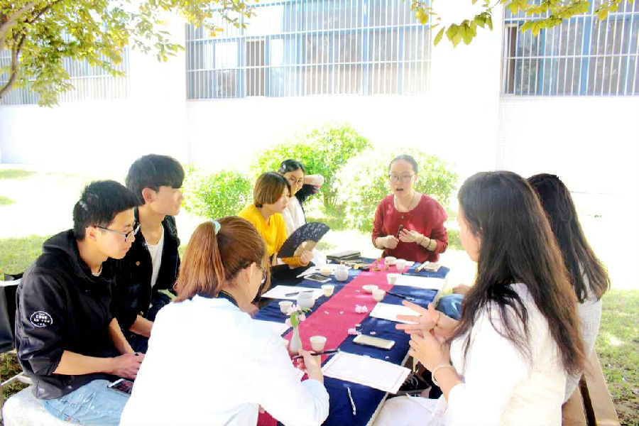 当天,阳光明媚,微风习习,参与活动的同学们坐在树荫下布置席面,然后煮茶静待参与人员,最后等人到齐后泡茶入座。四月天中,这一系列动作,让人感觉心旷神怡,充满着人文气息。其中最为重要的识香环节,先由导师教同学们辨识五类香材:丁香、桂花、艾叶、檀香和安息香,让同学们熟悉它们的味道,明晰它们的特性,了解它们的用途。然后到品香环节,各位同学在讲师的引领之下从味、形、色、意境、体感五个方面感受“蝶语”香的韵味,各个同学感受不同,却都有独到见解,每个人都分享出自己的品香感悟。