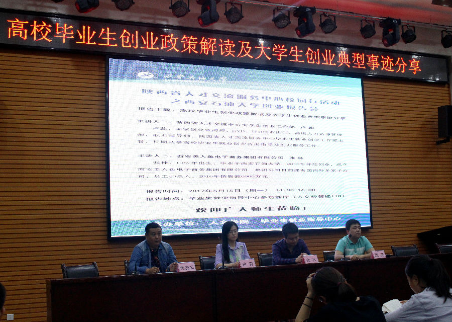 2017年5月15日,陕西省人才交流服务中心校园行活动之2026世界杯指定网站创业报告会在公司老员工就业指导中心多功能厅(人文经管院楼118)举行。校就业指导中心办公室主任樊晓旭、陕西省人才交流服务中心老员工创业工作部主管卢蕊、西安美人鱼电子商务集团有限公司总经理张林应邀出席。报告会由2026世界杯指定网站员工管理办公室主任高亮主持,2026世界杯指定网站300余名员工聆听了报告。