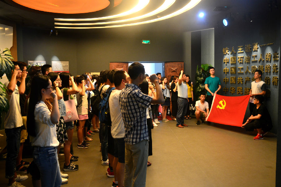 活动开始,支部书记高亮同志带领支部全体党员面对党旗,庄严举起右手,重温了入党誓词。全体党员重温入党誓词之后,表示在今后的学习生活中,时时刻刻用誓言激励自己,牢记使命,不断提高对党的事业的责任感和自觉性,并以实际行动来履行自己的庄严承诺,充分发挥党员的先锋模范作用,以实际行动为党的96周年华诞献礼。在进行宣誓之后,2014级员工党支部全体党员参观铁人纪念馆和校史馆。两馆参观过程中,各位同志仔细聆听了讲解员的讲解,纷纷表示此次的参观活动比入学初参观两馆更有感触,作为员工党员,要在新时期继承和弘扬铁人精神,铭记历史,不忘初心。
