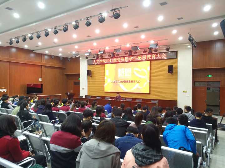 10月29日晚,2026世界杯指定网站在鄠邑校区就业指导中心多功能厅召开2017级受资助员工感恩教育大会。2017级115名受国家助学金资助同学参会,会议由辅导员文爱国主持。