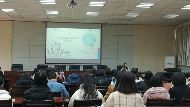 王敏在题为《国家汉办志愿者面试交流分享》的报告中从心理测试、综合面试、英语面试等三个方面出发,结合自身的海外教学经验,讲述了汉办面试的经历及志愿者精神的内涵。于明娇在题为《汉办志愿者面试》的报告中从面试环节、岗前培训、面试真题及出国建议等四个方面,对国家汉办志愿者的面试情况进行了具体的讲解与分析。