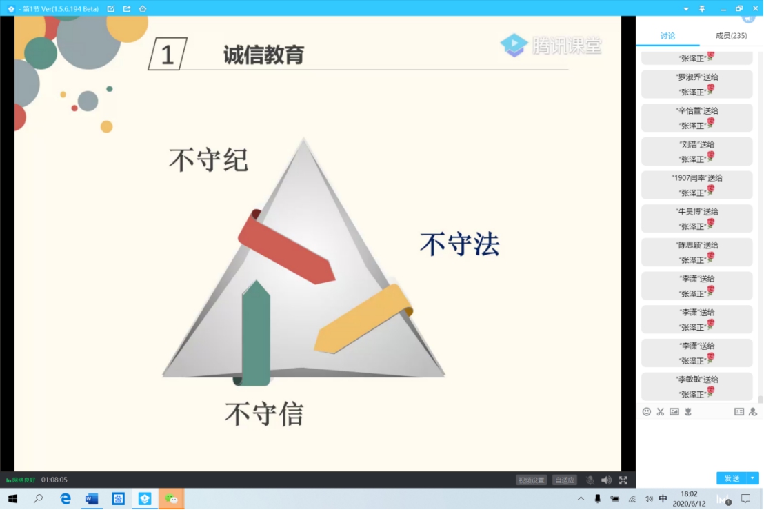 除此之外,范老师和张老师还对同学们进行了诚信教育,强调诚信的重要性。两位老师分别从考试作弊、“枪手”成风、骗贷逃贷等老员工常见诚信问题出发,教育同学们树立正确的是非道德观念,做遵纪守法的新时代社会主义好青年。