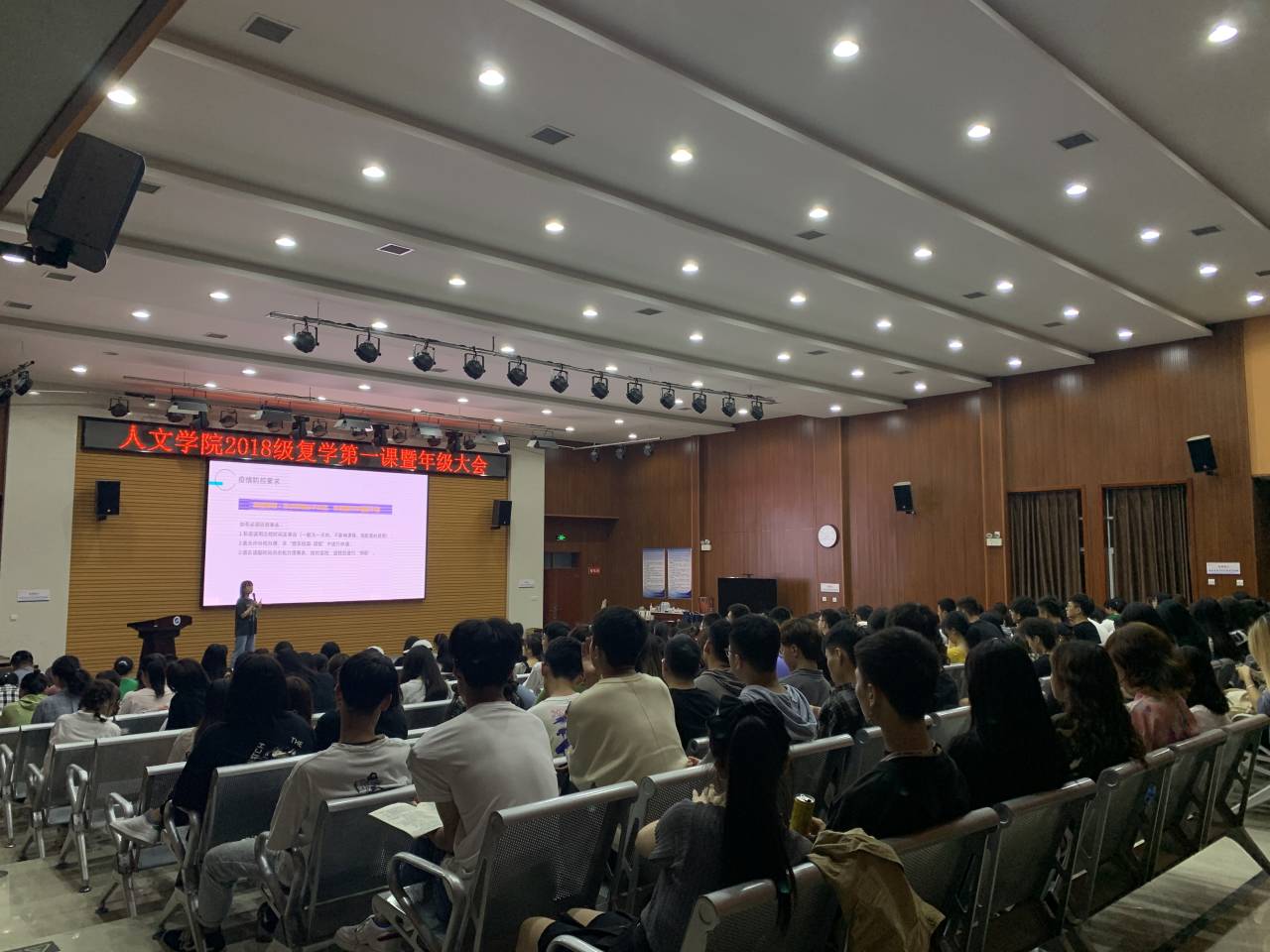 在2019级年级大会上,张老师向同学们介绍了疫情期间在校面对突发情况的应对方法,并提醒同学们在校期间做好个人防护工作,合理作息,健康饮食。张老师重点强调了开学前三周补考,正考以及9月份大学英语四六级考试的重要性,并要求同学们合理规划时间,树立学期目标,扎实学好本领,通过不断增强自身竞争力来应对瞬息万变的现代社会,度过一个有意义的大学时光。