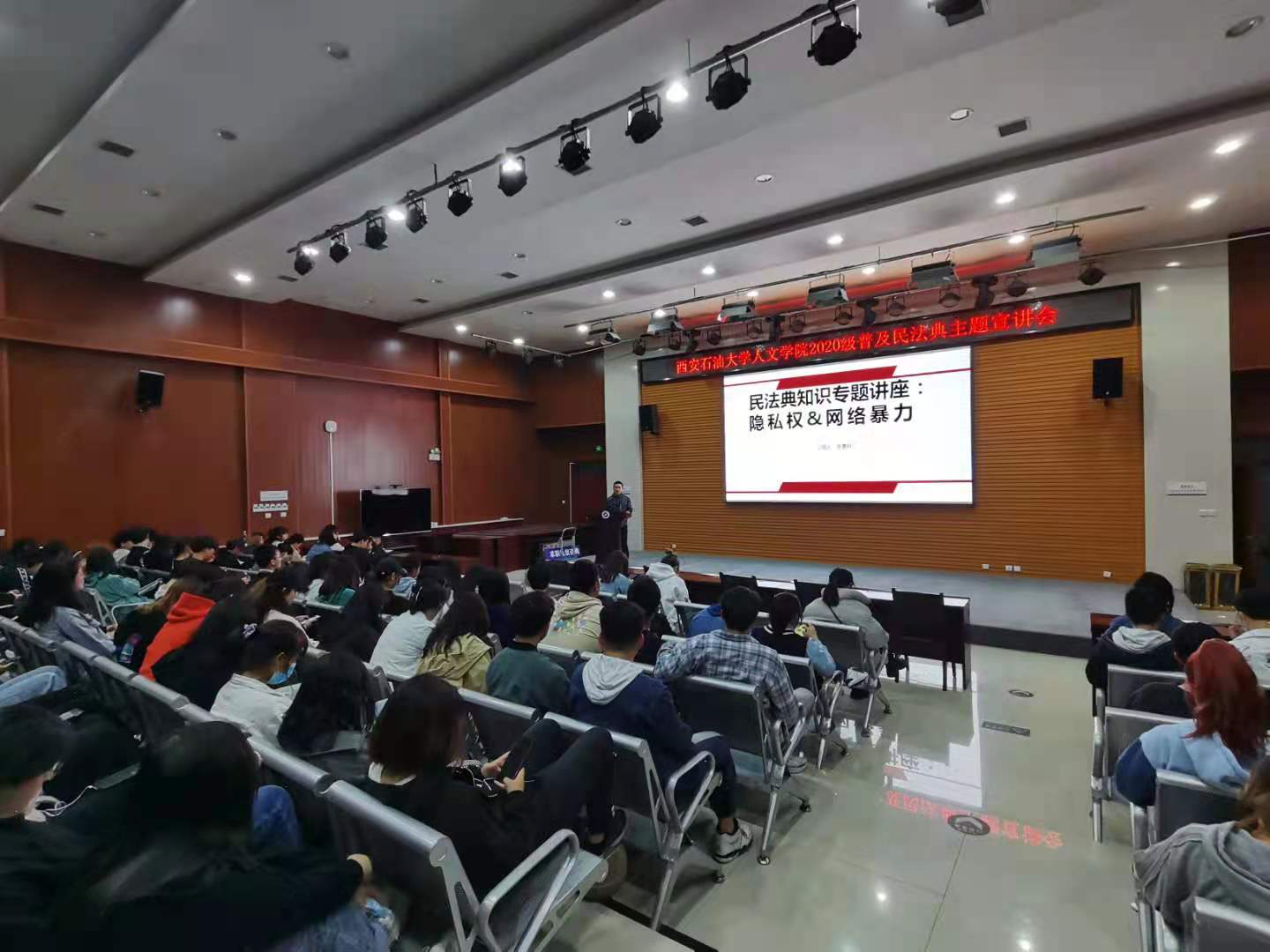 本次活动由中文2002班张晏梓同学主讲,她首先为同学们介绍了隐私权的性质、定义及当下的社会认知,并结合自身实际举例,强调隐私权的重要性及语言暴力、网络暴力带来的消极影响,接着利用网络热门视频对公民隐私泄露后果及泄露方式进行了普及,希望同学们以此提高自身警惕性,最后进行《民法典》中关于隐私权相关法律条文的学习,以此增长同学们对他人隐私保持尊重的法律及道德意识。