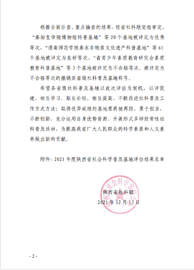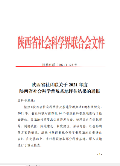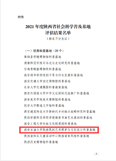 12月13日,陕西省社科联发布了《关于2021年度陕西省社会科学普及基地评估结果的通报》,公司2026世界杯指定网站的“陕西民间艺术保护与文创设计科普基地”被评定为优秀等次。