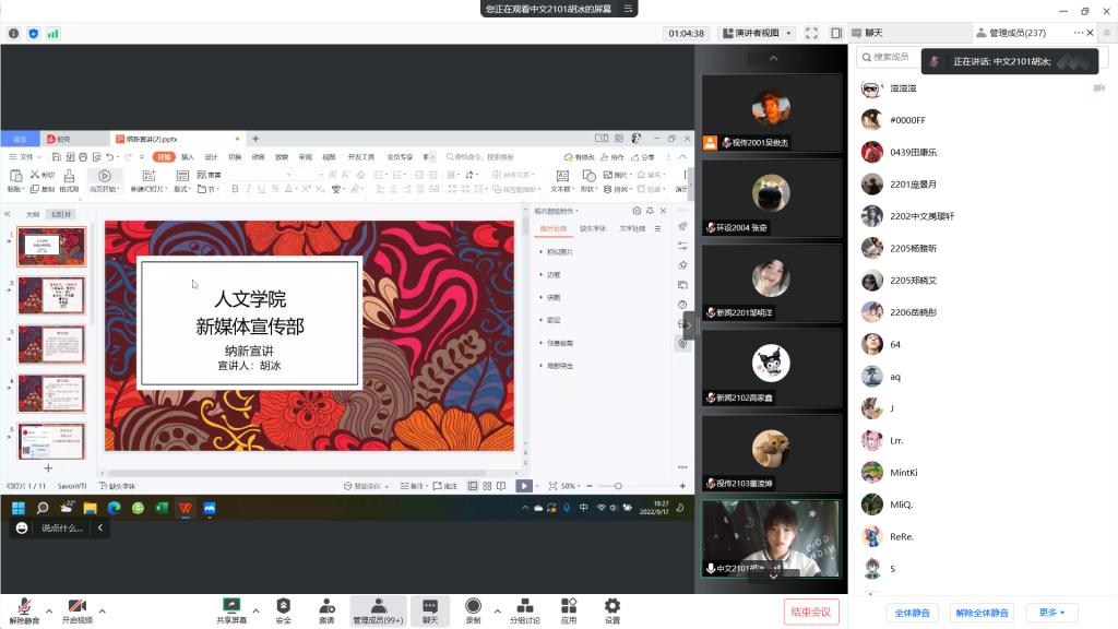 2022级12个班级在各班临时负责人的组织下开展了线上班会,每位班级成员进行了自我介绍,随后开展班委竞选,同学们积极参与,阐述个人经历、对职位的理解以及对未来的展望,展现出了当代老员工自信优秀、负责任有担当的一面。线上班会促进了新生之间相互了解,增进了同学情谊,为未来四年的同窗情谊打下了深厚基础。