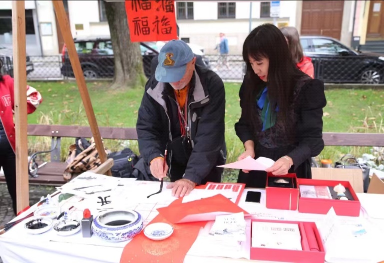 当地时间10月1日,中国驻斯洛伐克大使馆在斯洛伐克首都布拉迪斯拉发的赫维兹多斯拉夫广场(Hviezdoslavovo námestie)与印尼、日本、越南大使馆共同举办亚洲文化节。2019级刘丹同学被当地孔院派往此次活动,协助中国书法文化体验展台。刘丹说,印象最深的是遇到一位老人(下图),他学过很久汉语,喜欢中国文化,去过中国很多地方,练习太极拳也很久了。说到体验书法,老人最先写出的是“开”字。后来他又拿出手机,骄傲的展示:“华为”,熟练地在手机里找到很多汉字图片,并再一次用书法写下“永远”。刘丹说:我很荣幸在国庆这一天,远在海外可以参加这次有意义的文化传播活动,并作为参与者,让很多人更了解中国的书法文化,对我也是弥足珍贵的经历;在中华人民共和国成立73周年国庆期间,祝祖国山河无恙,国泰民安!