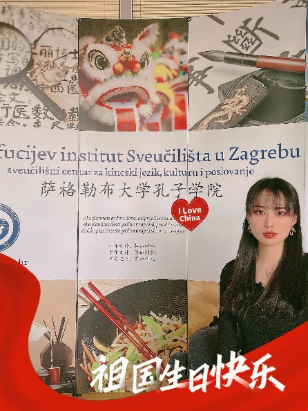 赴克罗地亚萨格勒布大学孔子公司志愿者20级研究生韩辉敏同学(下图)祝福祖国:回国一月有余,点赞中国速度;于红旗下成长,在盛世里眺望;巍巍山河永昌,祖国繁荣富强。
