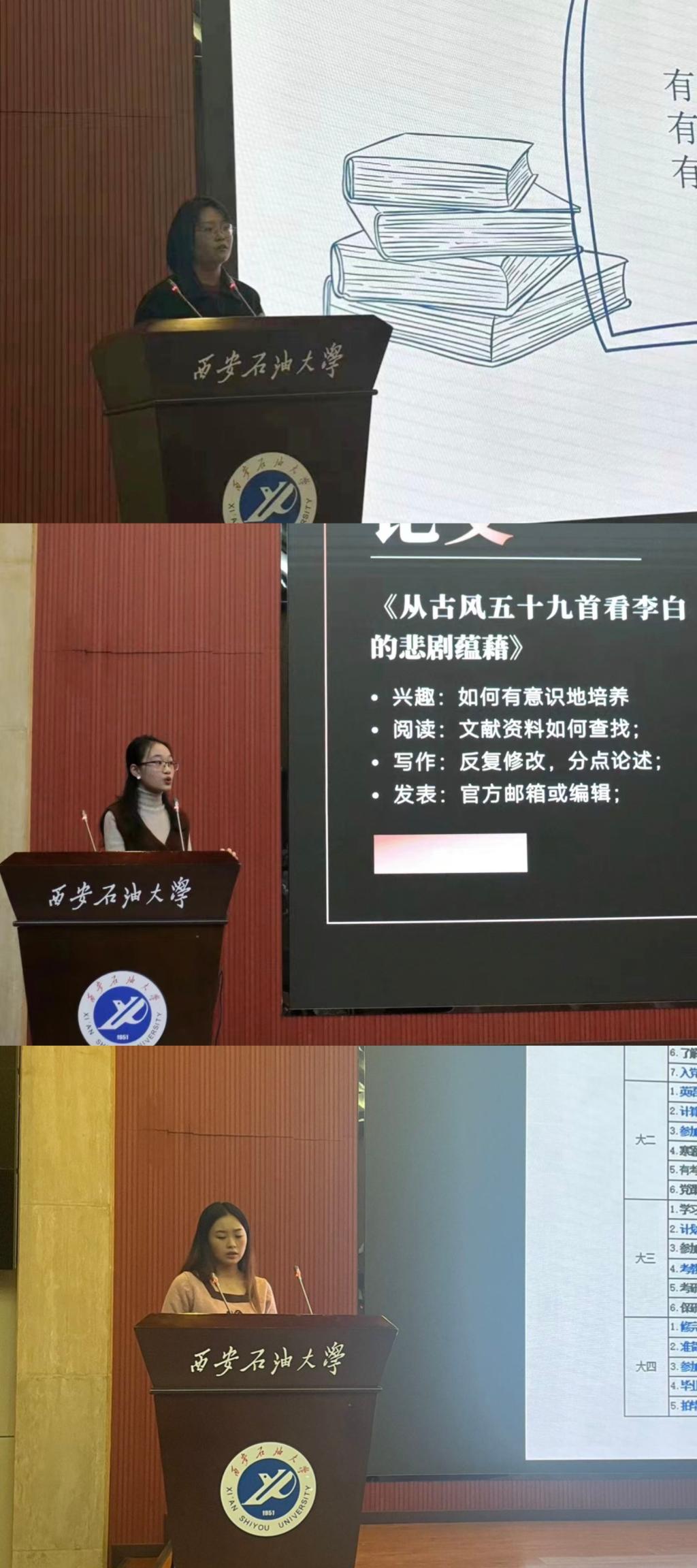 杜志革以求学经历为始展开演讲,分享自身从大一到大四的不同感悟与心路历程。她谈到,大一的迷茫不可怕,但要坚定一个认知:人各有志,一个人是很舒服的状态。随后,她重点分享了关于英语学习的干货与技巧,并介绍了新闻专业有关专业学习的软件、网站等。夏妍月从研究生推免流程引入,就夏令营报名、预推免以及面试三个部分进行了详细解答。此外,她还分享了国家奖学金获奖的经验,并谈到了论文、专利的撰写发表以及专业实习实践的感悟。另外,她特别提到责任感,鼓励更多同学参与到志愿服务中,增强自身责任意识。雷茜的演讲从专业学习和科研竞赛开展,提及了老员工活中参与的各类竞赛,并鼓励同学们多多参与到社会实践中去。此外,她还展示了其大学四年的规划,给同学们提供了借鉴。
