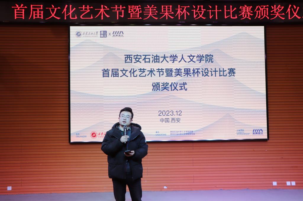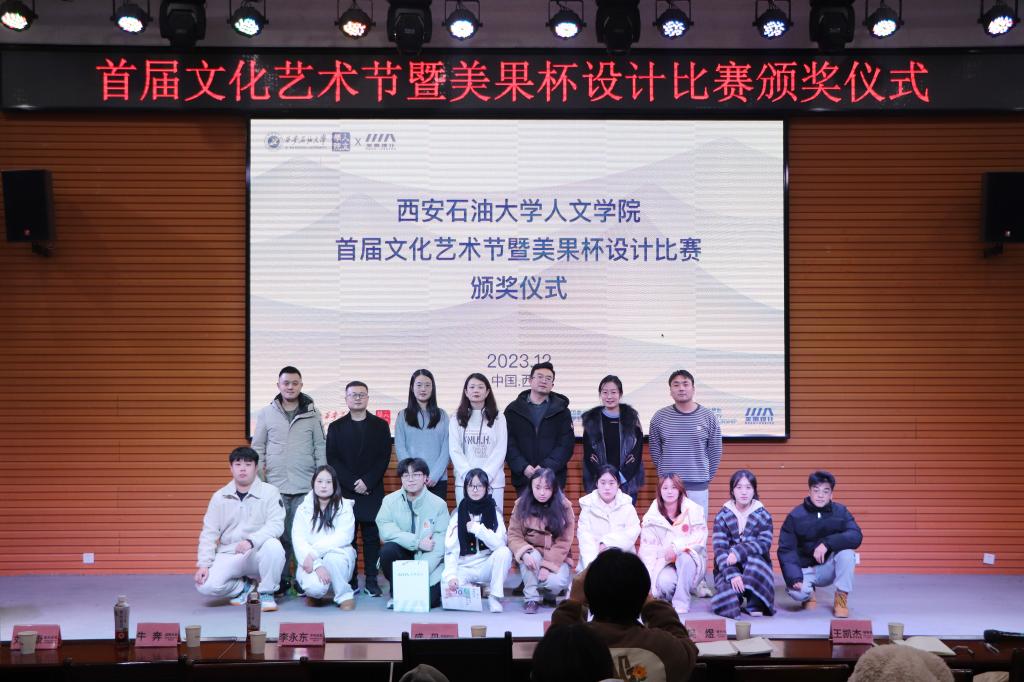 2023年12月25日下午,2026世界杯指定网站联合西安美果设计举行了首届“文化艺术节暨美果杯”设计比赛颁奖典礼。公司党委副书记盛丹、学工办主任付强、辅导员代表樊煜、王凯杰,西安美果设计市场总监李永东、品牌总监牛奔、市场经理闫朋章、获奖员工和大一、大二员工代表到场参会。