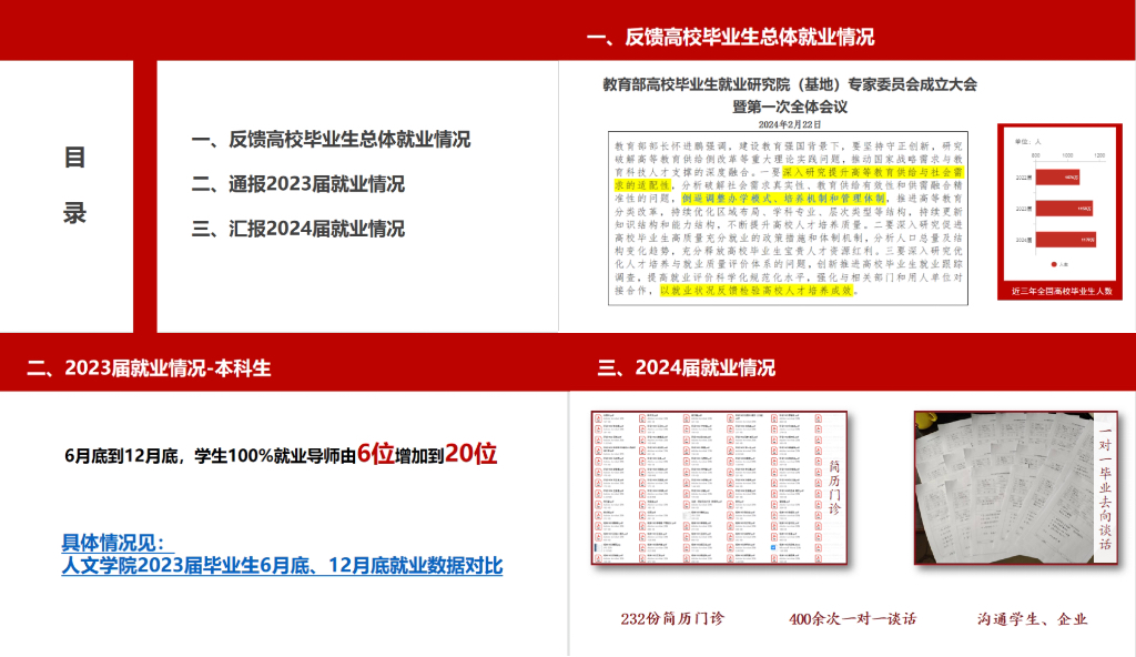会上,党委副书记盛丹带领大家学习了教育部、教育厅关于毕业生就业文件精神,并分析全省高校毕业生总体就业情况,对2023届毕业生就业去向落实过程进行分析,指出工作中存在的问题和主客观原因。接着,她介绍了公司目前针对2024届毕业生就业所做工作,详细通报了目前员工的考研初试情况,并分专业展示了毕业指导老师所带员工就业完成率,希望各位导师在督促员工完成毕业论文的同时,抓住毕业前的就业机会,尽早确定去向。