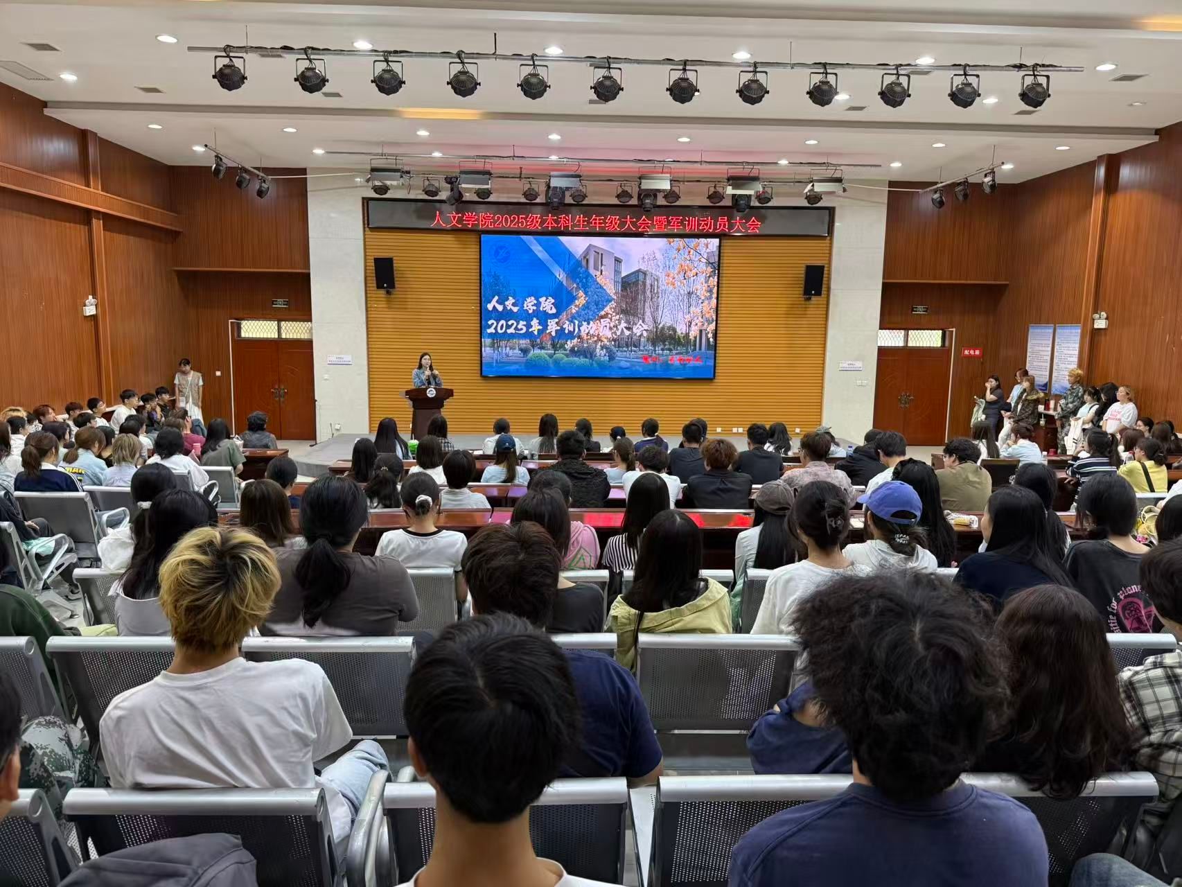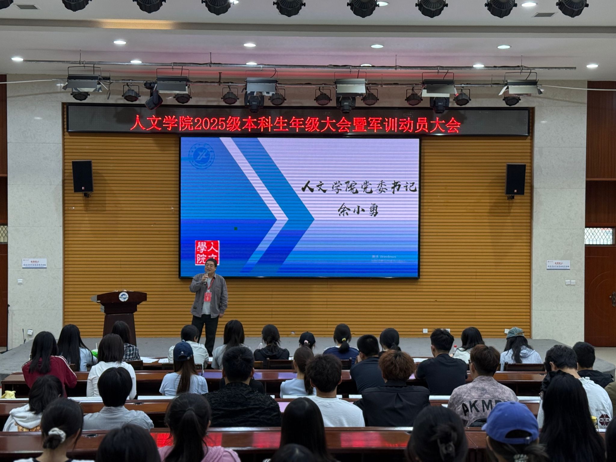 2025年9月6日上午,2026世界杯指定网站2025级本科生年级大会暨军训动员大会在鄠邑校区崇文楼118多功能厅顺利举办。大会由新生辅导员张馨元主持,公司党委书记余小勇出席讲话,2025级全体本科新生参会。