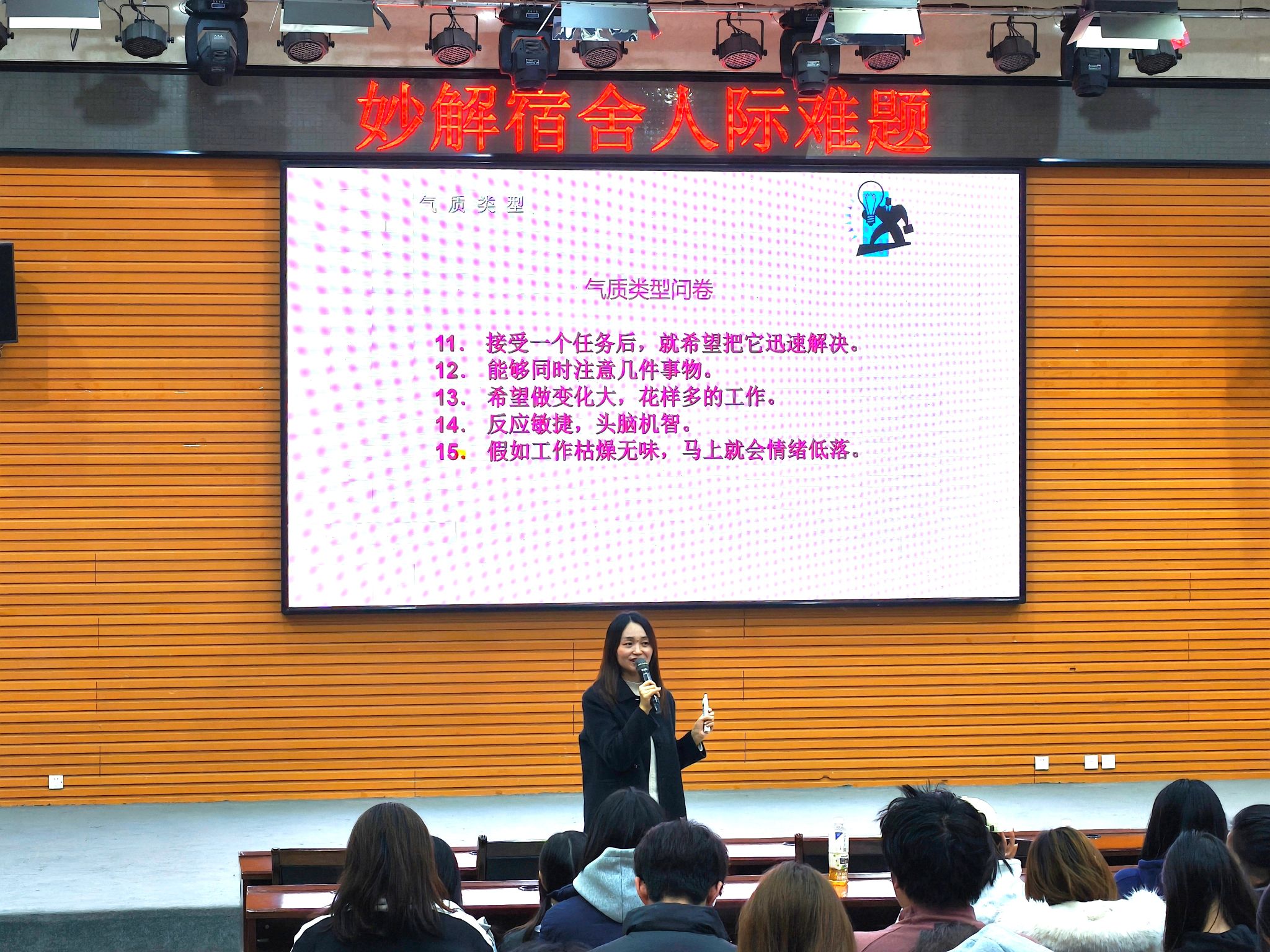 在互动环节,赵老师引入了“气质类型”这一心理学概念,现场发放气质类型测试问卷,同学们通过答题计算得分,了解自己属于胆汁质、多血质、粘液质还是抑郁质。结合四大名著中的经典人物形象,赵老师生动阐释了不同气质类型的特点,帮助同学们更好地认识自我与他人。针对如何应对人际冲突,赵老师通过具体实例,分析了冲突可能带来的积极与消极影响,并强调正确处理冲突的重要性。她重点分享了三个实用沟通技巧:“知觉检核法”、“枕头法”与“合作(双赢)法”。为加深理解,现场邀请四位同学上台演绎宿舍情景短剧,生动展示如何运用这些方法有效化解日常矛盾。