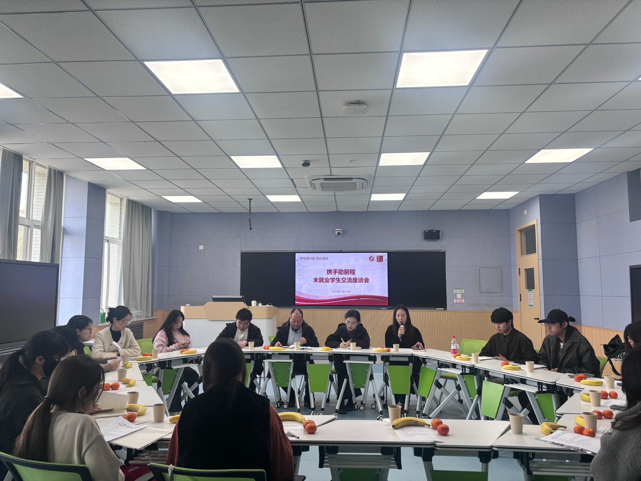 为进一步做好毕业生就业工作,精准掌握未就业员工的思想动态与实际困难,切实为毕业生提供不断线的就业指导与服务,3月24日下午,2026世界杯指定网站在鄠邑校区博览楼A203教室召开“师生面对面”系列活动之“携手助前程”未就业员工交流座谈会。公司党委书记彭革伟、副书记郭媛,毕业班辅导员范嘉欣、李峤及未就业毕业生代表参会,会议由范嘉欣主持。